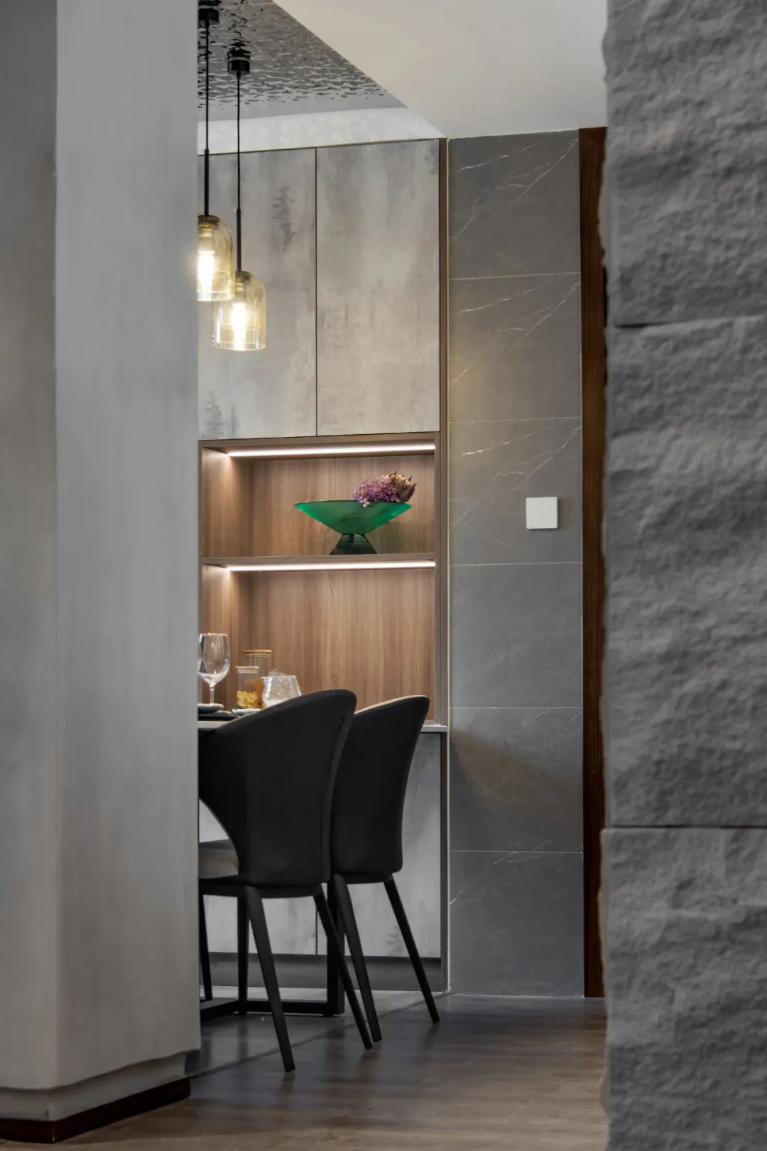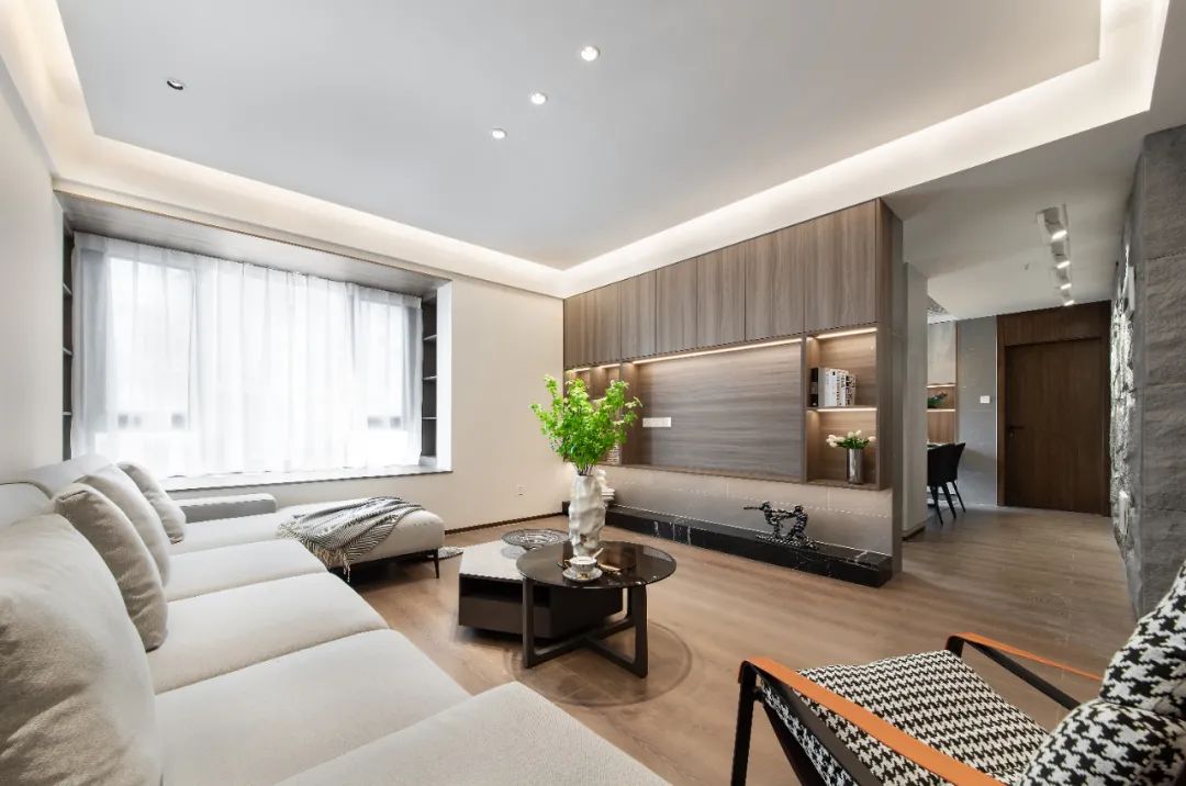 整體雖簡約,但不簡單,墻面運用藝術高仿石材裝飾,紋理質感強,光影效果好;懸浮電視柜用格調裝飾獨有工藝固定,穩定性佳,也減少地面衛生死角,減輕家務疲憊;而無主燈設計極簡造型的背后,是復雜卻有序的水電規劃,和極其繁瑣的工藝。