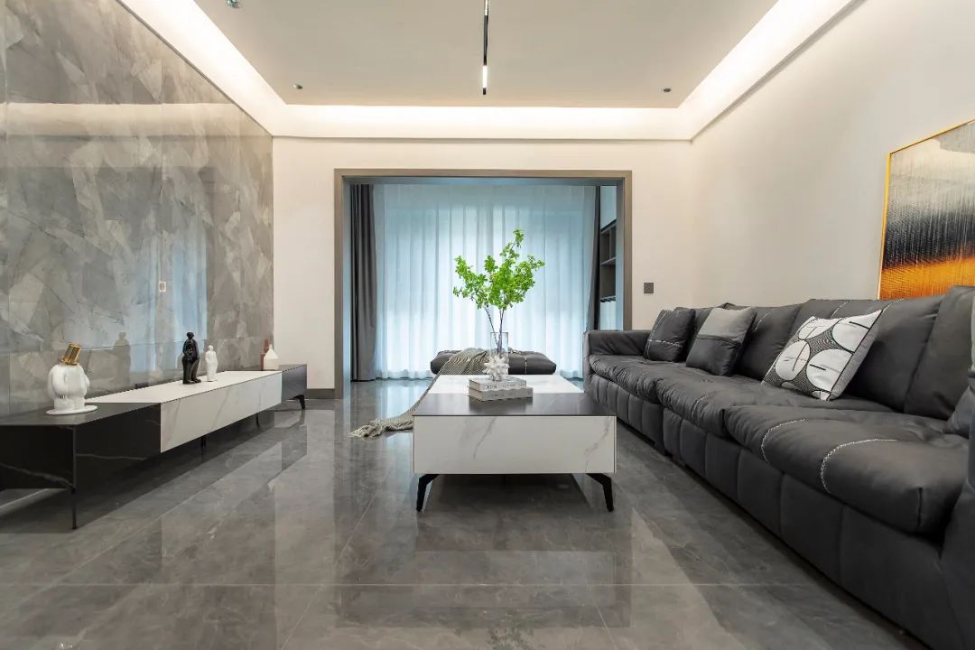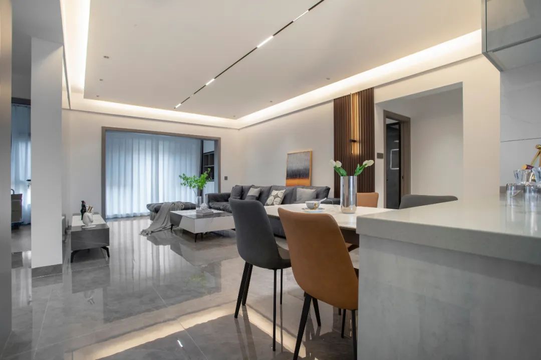 客廳采用無主燈設計,頂部的線條燈、燈帶及局部的氛圍燈結合,整體燈光會更加溫馨柔和。