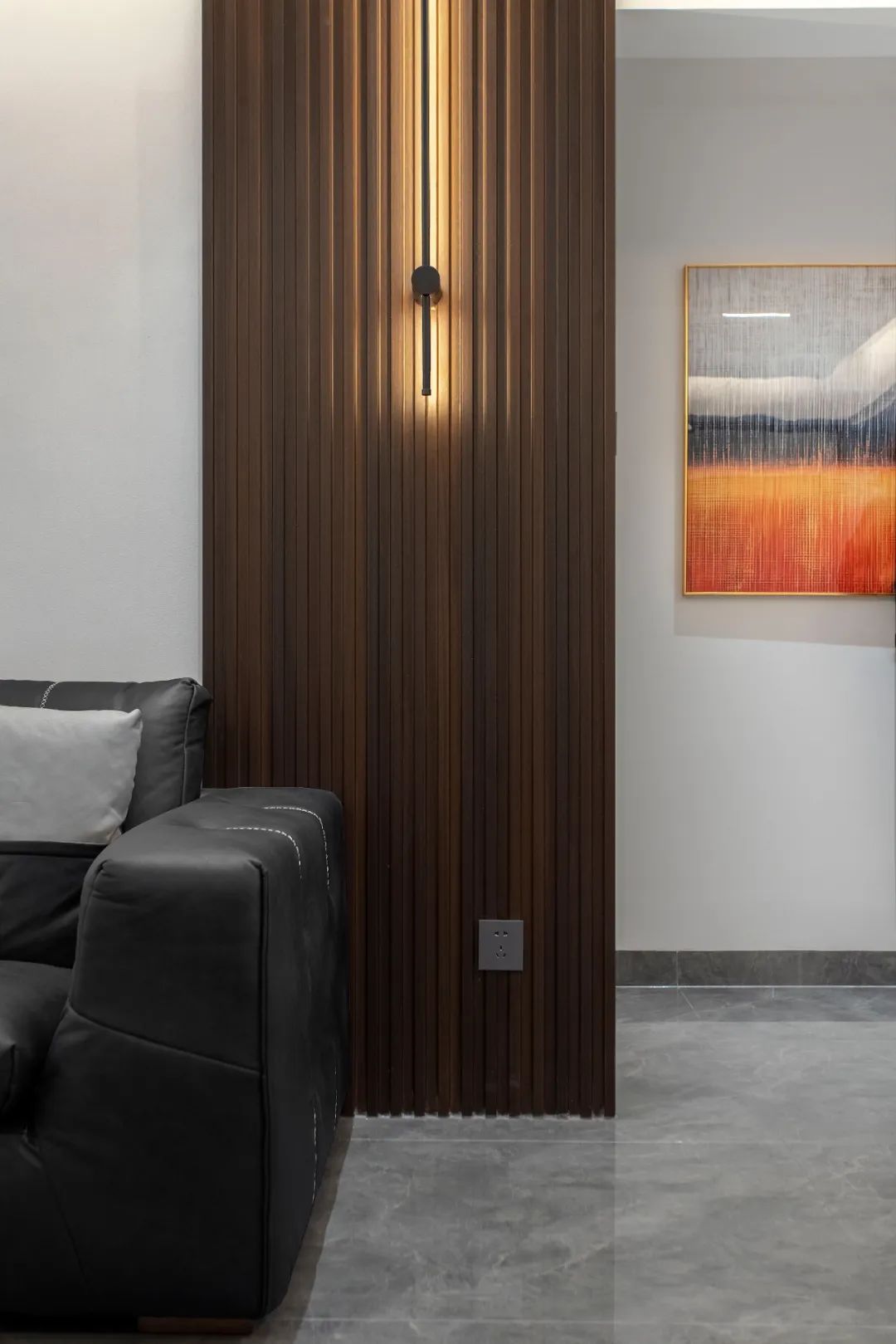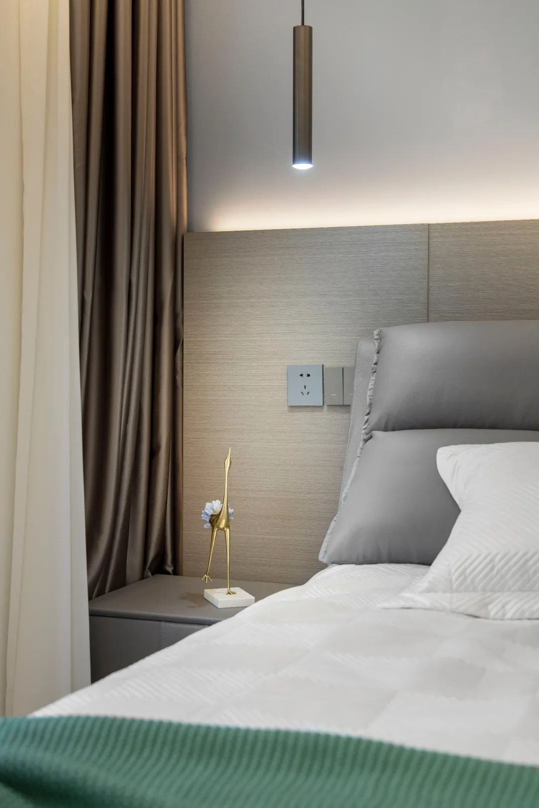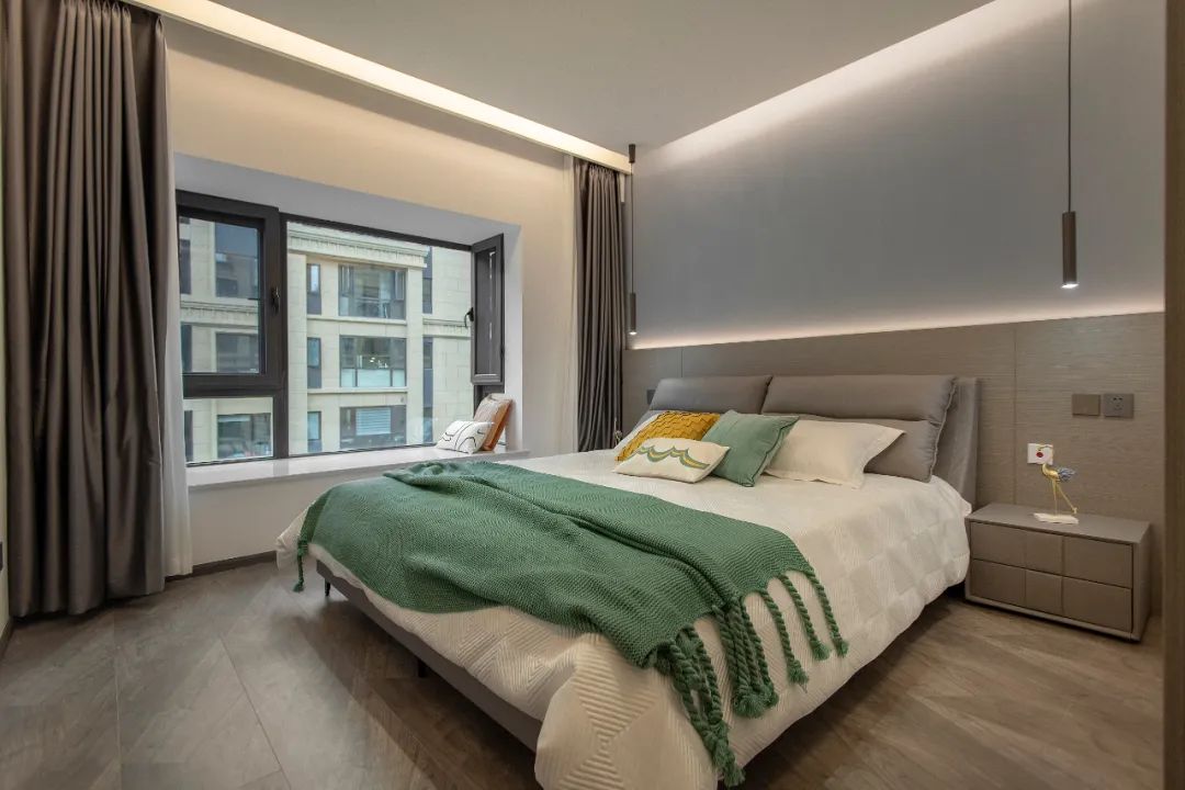 主臥暖深灰色的床頭背景墻帶來溫暖、放松的氣氛,完成空間氛圍的轉換。