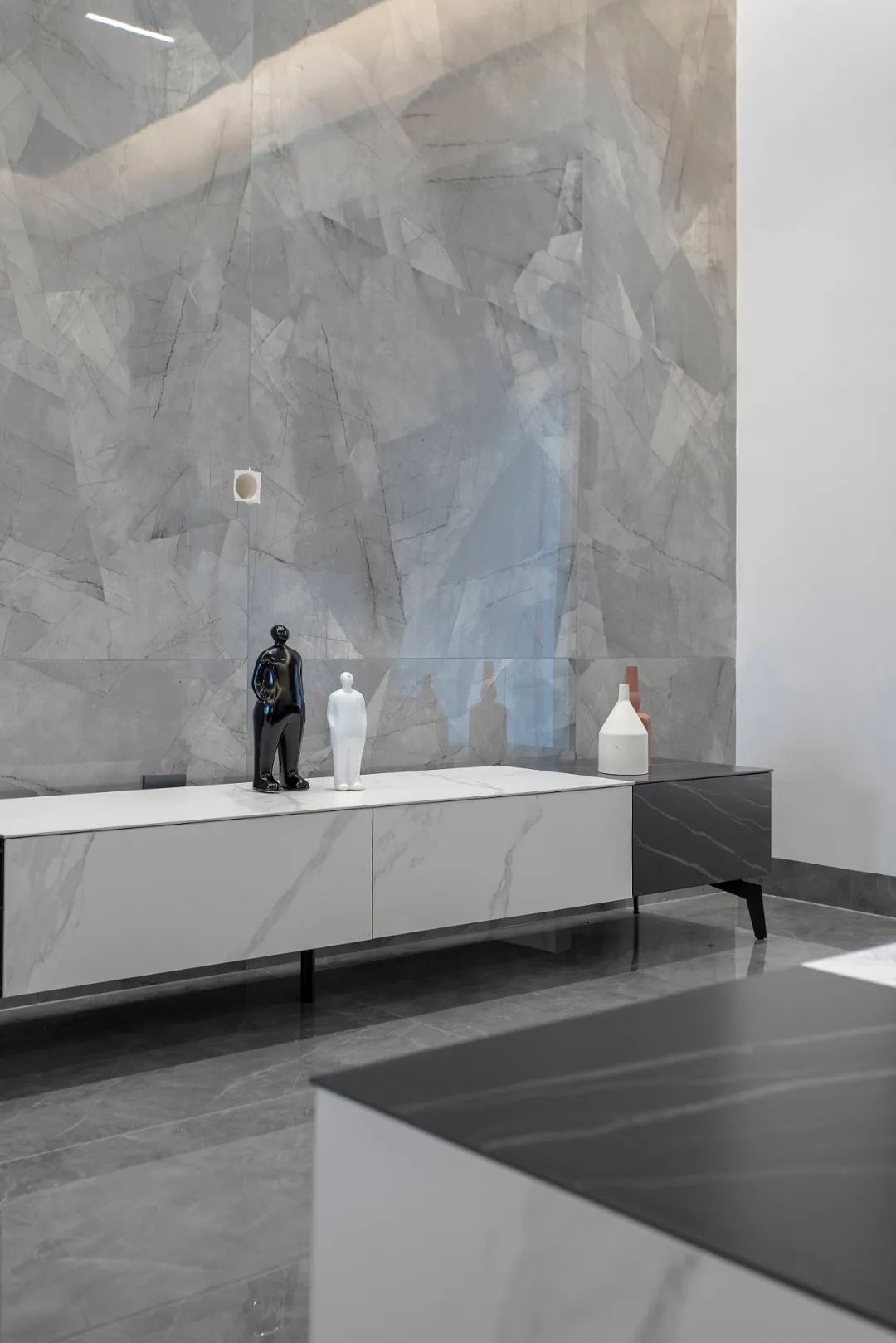 電視背景墻構造簡潔卻層次感十足,歸功于設計師對不同材質的比例把握。