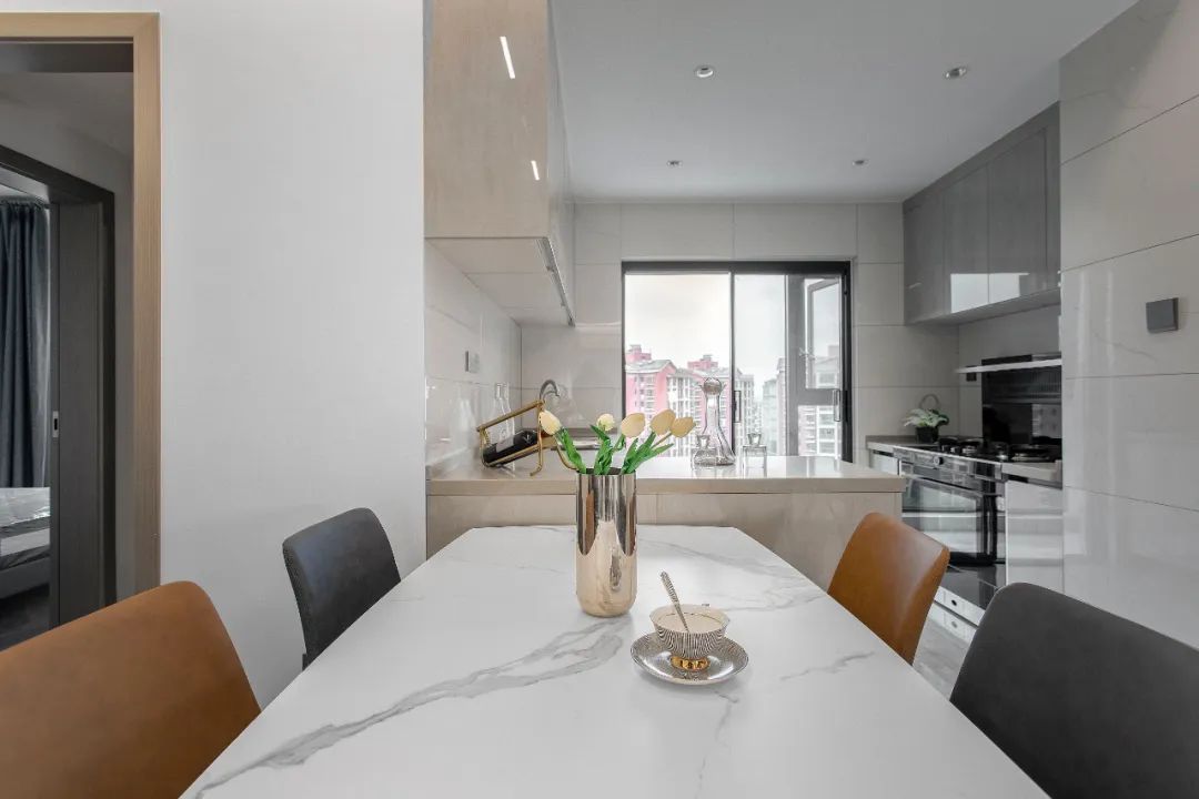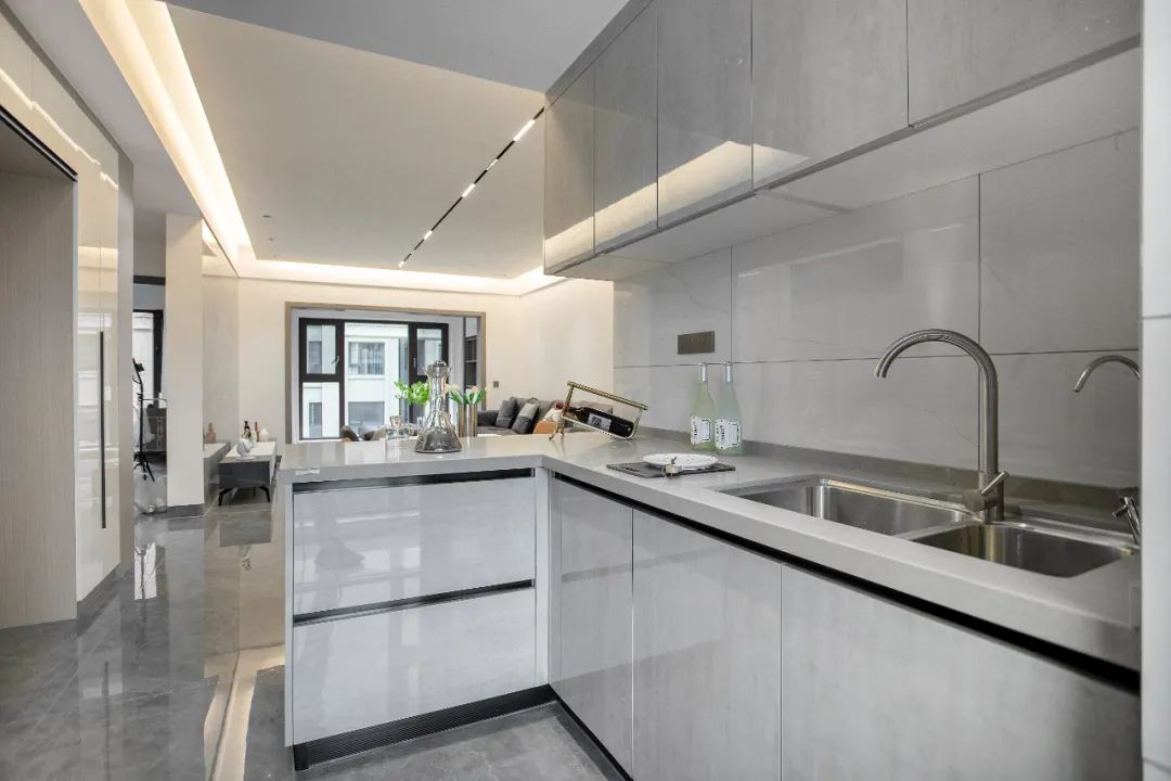 儲物柜,為空間帶來更加明朗輕盈的視覺效果。安裝軌道式插座,可以根據需要增減、移動插座,方便各類小電器的使用。
