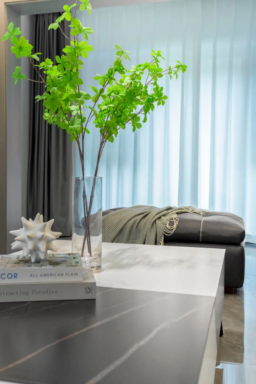 陽臺和客廳打通,成為客廳的延伸,落地窗引入大量自然光,聯絡室內外,可以觀景休閑將心境從繁雜的世俗中短暫抽離。