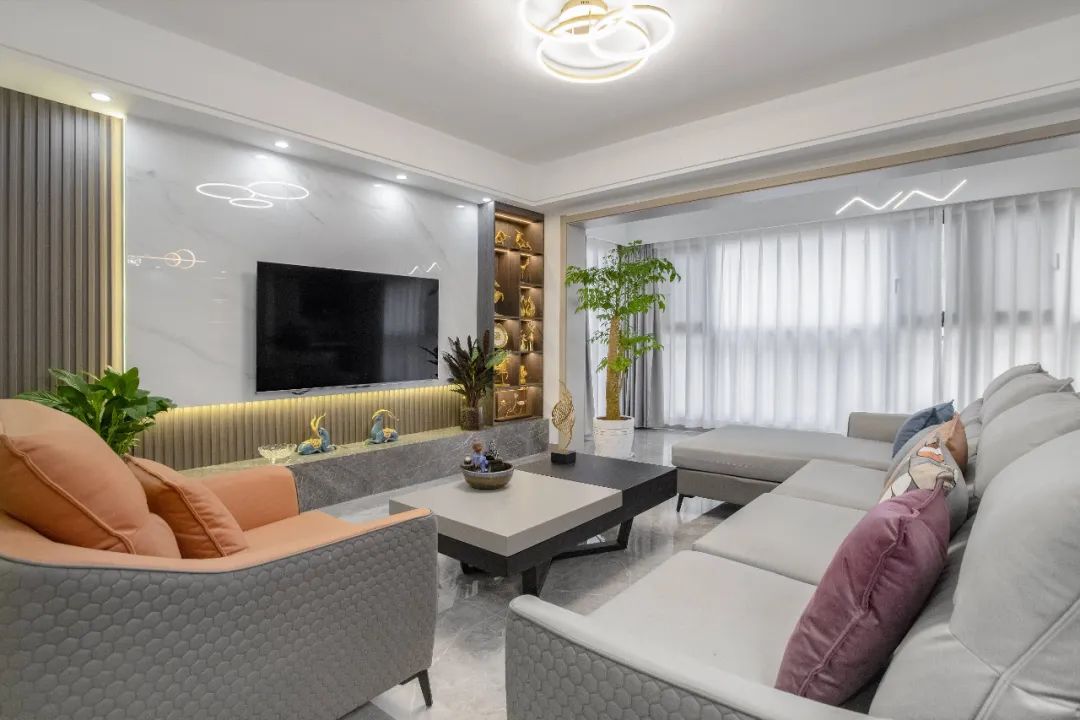 客廳區(qū)域采用無(wú)主燈設(shè)計(jì),整個(gè)空間看上去更加大氣。地面通鋪灰色大理石紋瓷磚,奠定了空間現(xiàn)代質(zhì)感的基調(diào)。客廳L型沙發(fā)落于舒適的同色系地毯之上,增加家的溫馨舒適感。