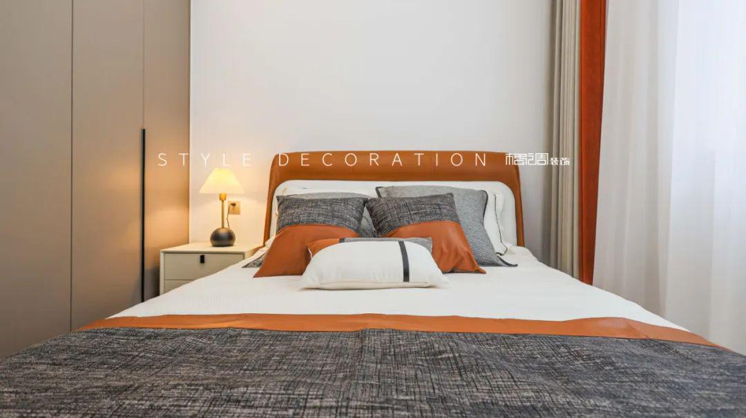 主臥背景墻同樣木飾裝飾材料,強化了背景墻的整體感,放大了空間的視覺寬度。